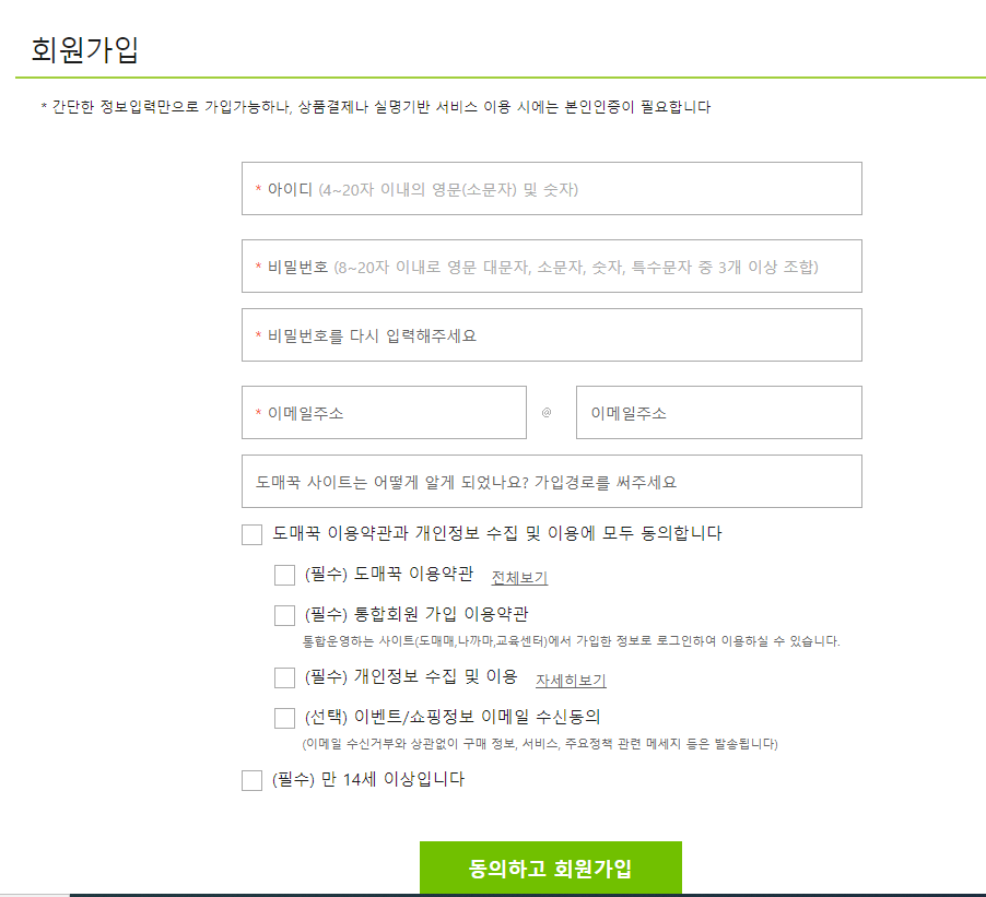 3. 도매꾹 회원가입을 누른경우 정보를 입력하고 회원가입을 누른다.(일반회원 가입)
